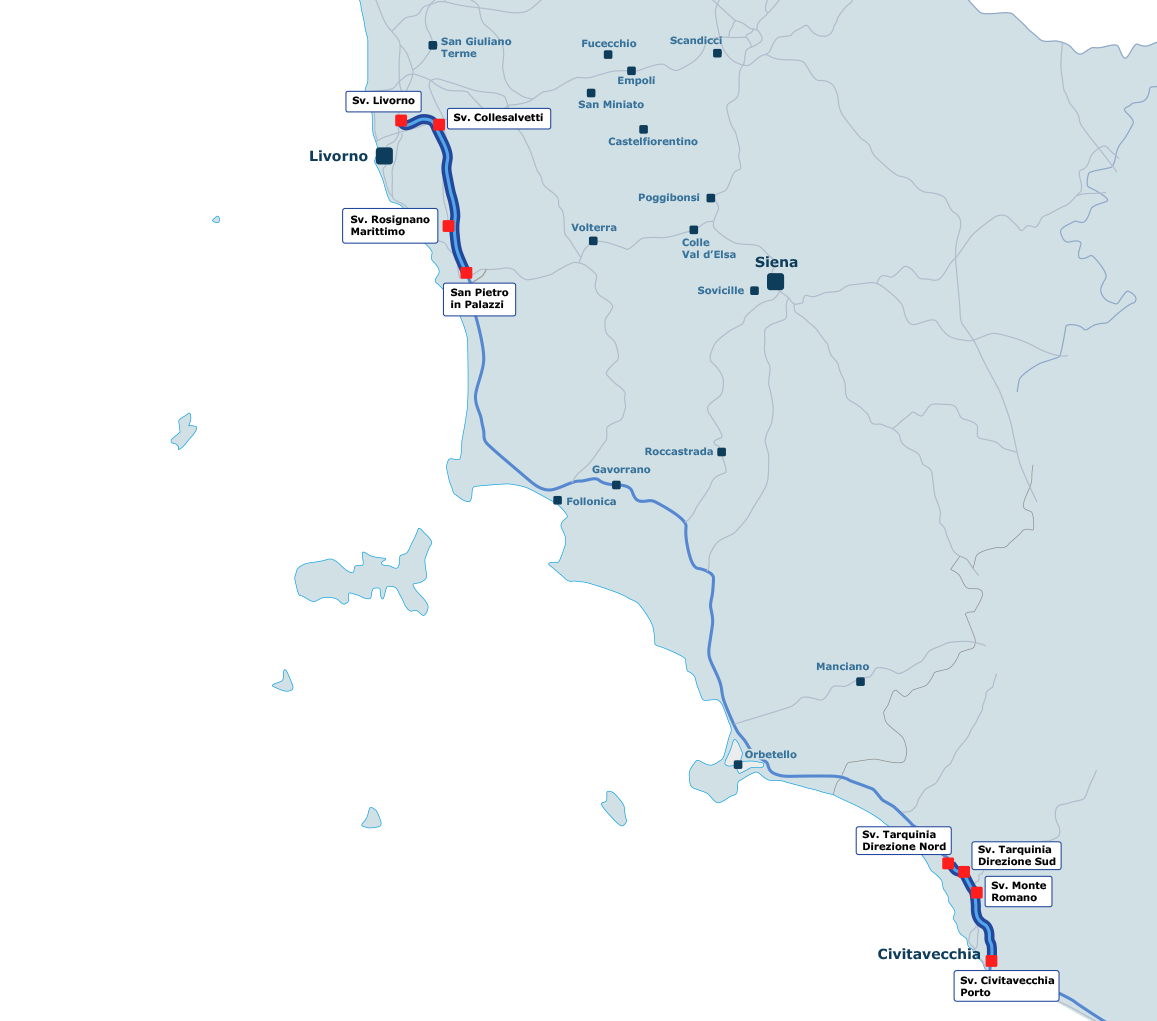 L’autostrada Livorno – San Pietro in Palazzi, prima tratta della Livorno Civitavecchia, costituisce il prolungamento verso sud della direttrice Ligure Tirrenica (A 12).Consente il collegamento, lungo il Corridoio Plurimodale Tirrenico, tra Piemonte, Liguria, Lombardia, Firenze, Valdarno e Grosseto, l’Argentario, la Sardegna, Roma e il Sud.